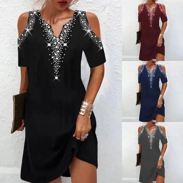 Γυναικών V-λαιμός Off ώμου τυπωμένο φόρεμα με κοντό μανίκι