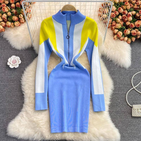 Κομψό φερμουάρ γιακά πλεκτό φόρεμα πουλόβερ