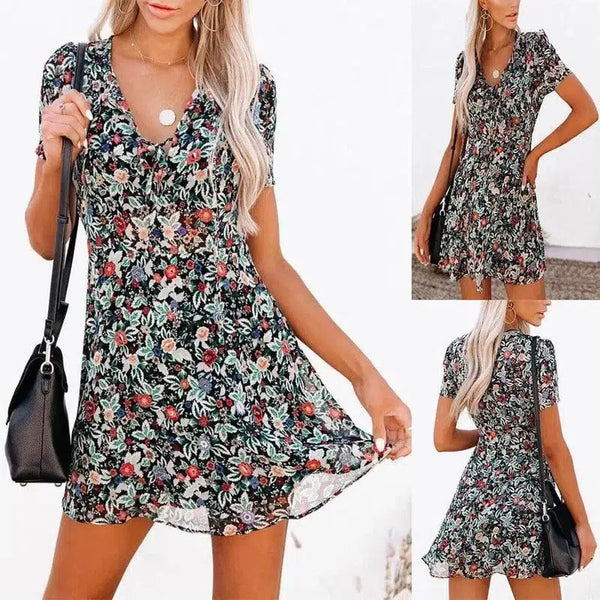 Γυναικείο κοντομάνικο φόρεμα με λαιμόκοψη V Floral