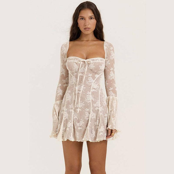 Δαντέλα τετράγωνο κολάρο φόρεμα Bell-κάτω μακρύ μανίκι δεμένα A- γραμμή φορέματα γυναικεία ρούχα
