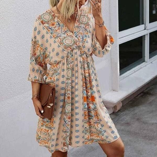 Διασταυρούμενα σύνορα V-λαιμός Μέση τελειώματα εκτύπωση φόρεμα