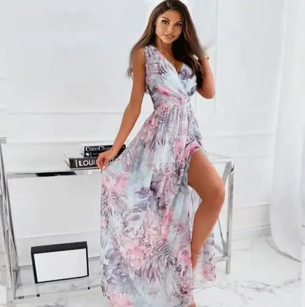 Καλοκαίρι σιφόν εκτύπωσης δαντέλα-up φόρεμα αμάνικο γυναικών