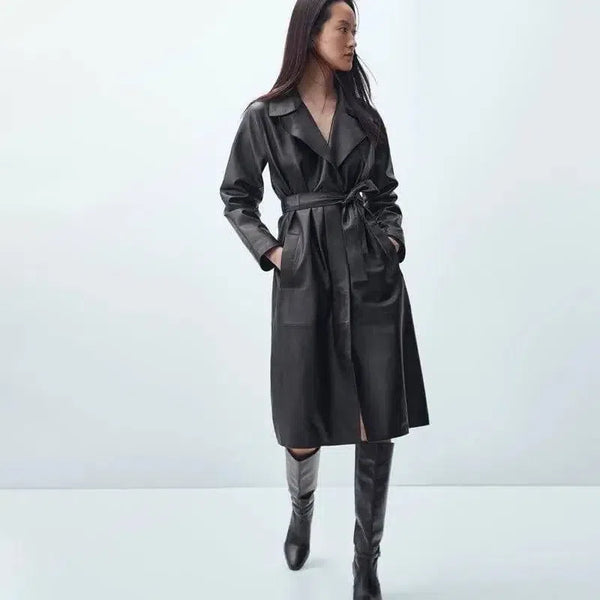 Κομψό παλτό με ζώνη από ψεύτικο δέρμα