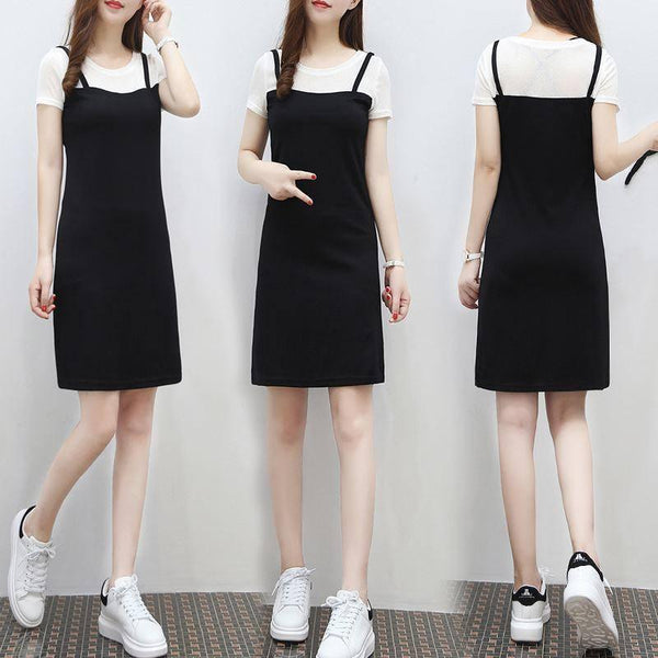Σύντομο μανίκι μεσαίο μακρύ ψεύτικο δύο κομμάτι φόρεμα με τιράντες καλοκαίρι
