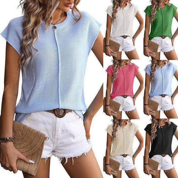 Νέα πλεκτά στρογγυλό λαιμό βραχύ μανίκι Top καλοκαίρι Casual χαλαρό