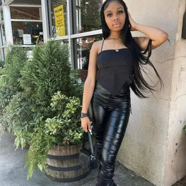 Στενό πλισέ παντελόνι από δερμάτινο στρέτς με υψηλή μέση