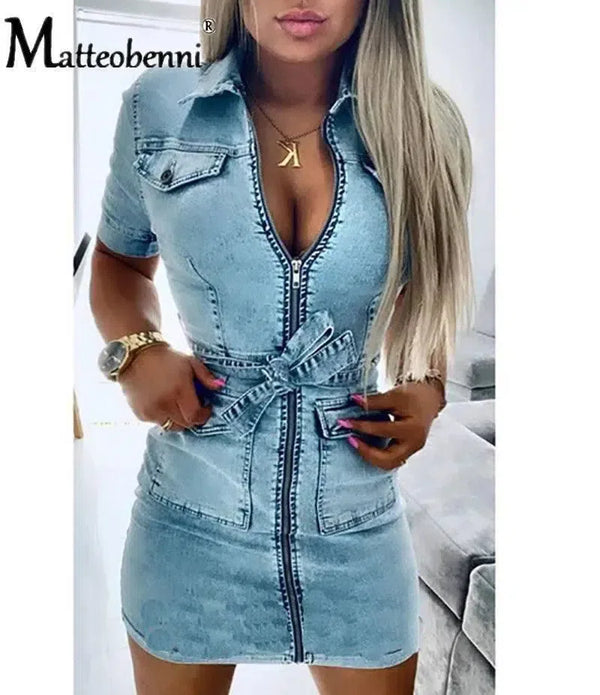 Denim φόρεμα φερμουάρ Casual V Nec