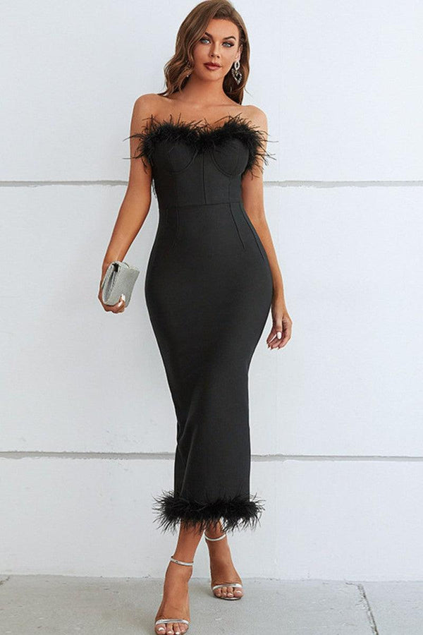 Feather Trim Strapless Sweetheart Neck Dress