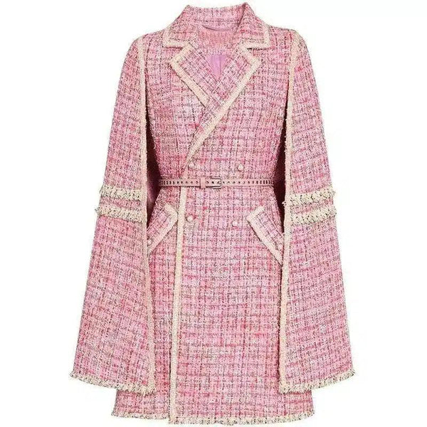 Γυναικείο παλτό τουίντ με ζώνη και λεπτομέρεια κρόσσια