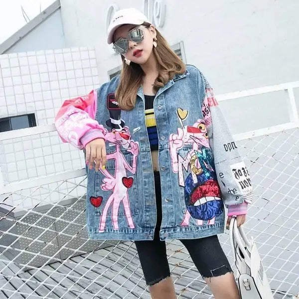 Cartoon Leopard Sequin εκτύπωσης ραφή μεσαίου μήκους τζιν