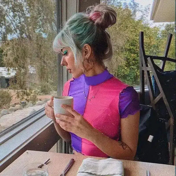 κοντομάνικο ομφαλό μπλουζάκι με πλέγμα αντίθεσης