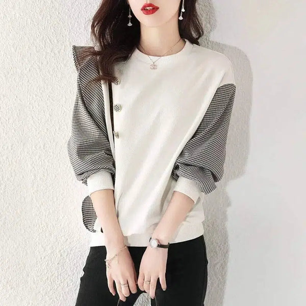 Design Sense Lantern Sleeve Stitching καρό κορεατικό Hoodie