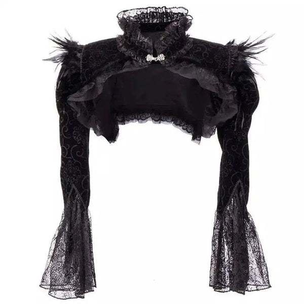 - Στυλ λαιμόκοψης ή ώμου: Υψηλός δαντελένιος γιακάς με τελείωμα από φτερά