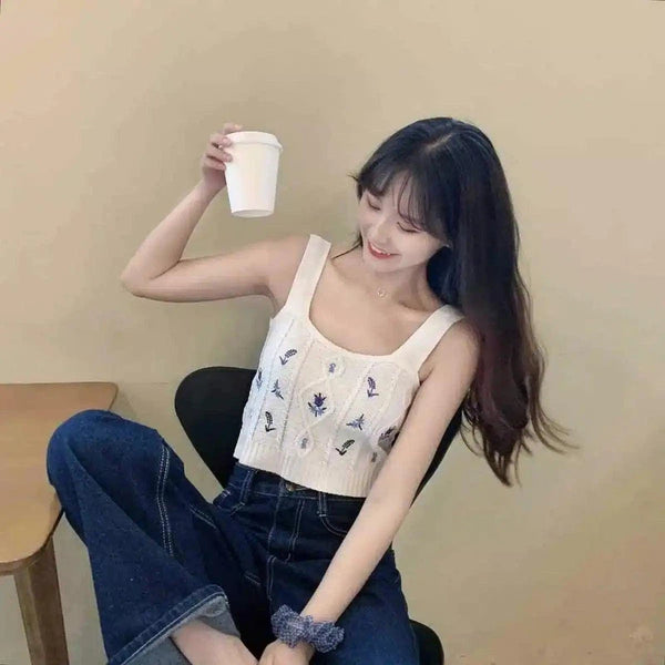 Πλεκτό Floral Crop Top αμάνικο Casual Wear