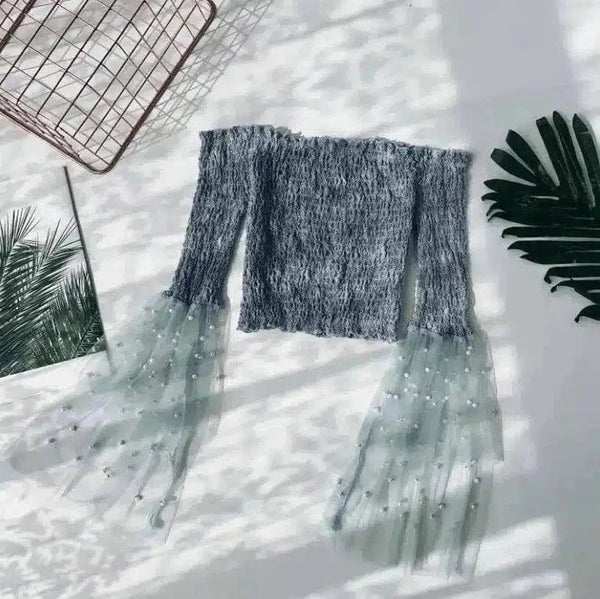 Γούνινο Crop Top με μανίκια από τούλι με χάντρες