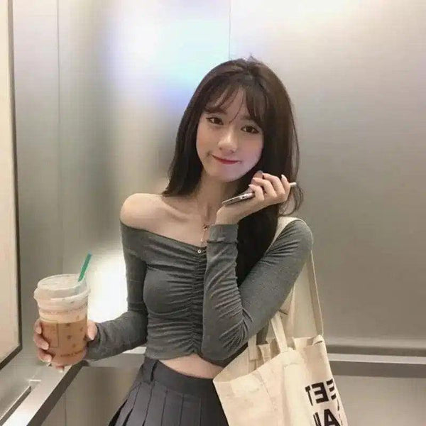 Κοντό μακρυμάνικο τοπ με δαντέλα και έναν ώμο
