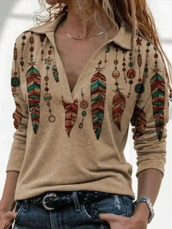 Ρετρό μακρυμάνικο τυπωμένο πουκάμισο πουλόβερ με V-λαιμό