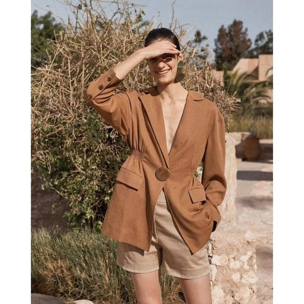 - Σχεδιαστικές λεπτομέρειες: Διαθέτει ένα κλείσιμο με κουμπιά δήλωσης και μπροστινές τσέπες για λειτουργικότητα