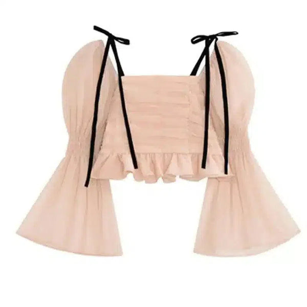 Smocked Crop Top με Tie-Strap και μανίκια Bell