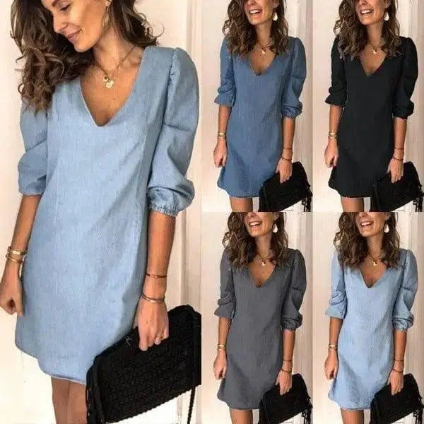 V-λαιμός κοντομάνικο casual χαλαρό βαμβάκι και λινό φόρεμα
