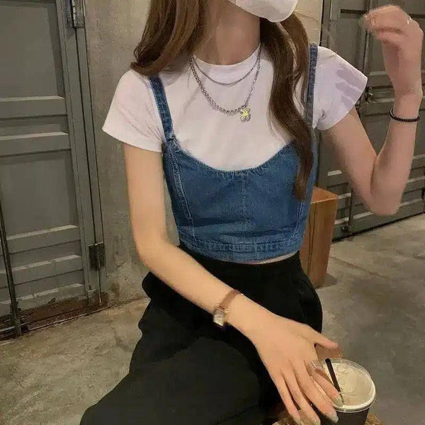 - Τύπος ενδύματος: Στρωτό σύνολο με ένα denim crop top πάνω από ένα βασικό λευκό t-shirt